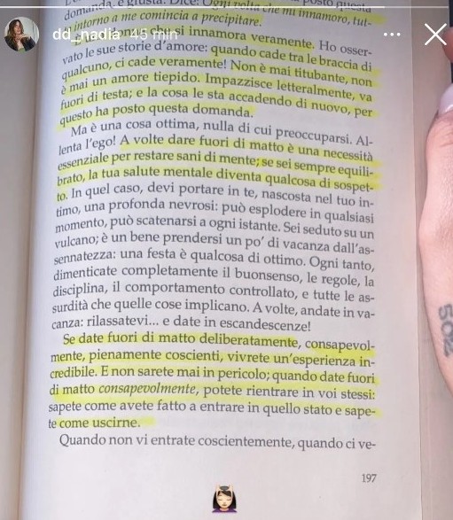 A distanza di qualche giorno dalla scelta, Nadia ha rotto il silenzio sui social con una storia su Instagram che ha attirato l’attenzione. La corteggiatrice ha postato una pagina di libro evidenziata, che molti fan hanno interpretato come una frecciatina diretta a Gianmarco e al suo percorso nel programma.