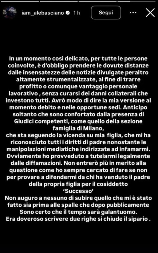 "In un momento così delicato, per tutte le persone coinvolte, è d’obbligo prendere le dovute distanze dalle insensatezze delle notizie divulgate peraltro altamente strumentalizzate, al fine di trarre profitto o comunque vantaggio personale lavorativo, senza curarsi dei danni collaterali che investono tutti. Avrò modo di dire la mia versione al momento debito e nelle opportune sedi. Anticipo soltanto che sono confortato dalla presenza di Giudici competenti, come quello della sezione famiglia di Milano, che sta seguendo la vicenda su mia figlia, che mi ha riconosciuto tutti i diritti di padre nonostante le manipolazioni mediatiche indirizzate ad infamarmi.Ovviamente ho provveduto a tutelarmi legalmente dalle diffamazioni. Non entrerò più in merito alla questione come ho sempre cercato di fare se non per provare a difendermi da chi ha venduto il padre della propria figlia per il cosiddetto ‘Successo’. Non auguro a nessuno di subire quello che mi è stato fatto sia prima alle spalle che dopo pubblicamenteSono certo che il tempo sarà galantuomo. Era doveroso scrivere due righe si chiude il sipario"